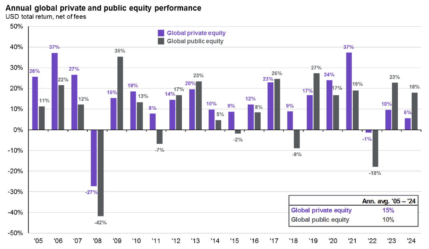 Recent innovations—particularly evergreen and semi-liquid fund structures—are helping expand access and improve flexibility for a wider range of investors. Combined with the recent performance gap between public and private markets, today’s environment may represent a compelling opportunity for long-term investors to consider private equity exposure as part of a strategic allocation.