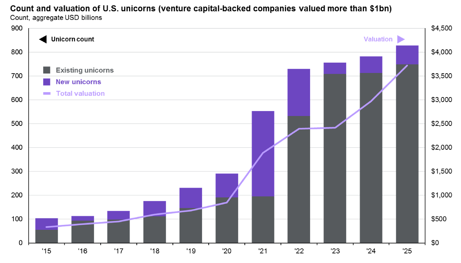 Similar to Anthropic, SpaceX is also looking at an IPO valued at north of $800 billion. Companies that are backed by private equity and valued above $1 billion are known as “unicorns.” During 2020–2021, accommodative financial conditions pushed private valuations higher, accelerating unicorn formation. After 2022, a more challenging exit environment reduced IPOs and M&A activity, keeping companies private for longer. Together, these dynamics have led to a larger universe of unicorns than in the past, making private markets increasingly difficult for investors to ignore without risking missed opportunities.