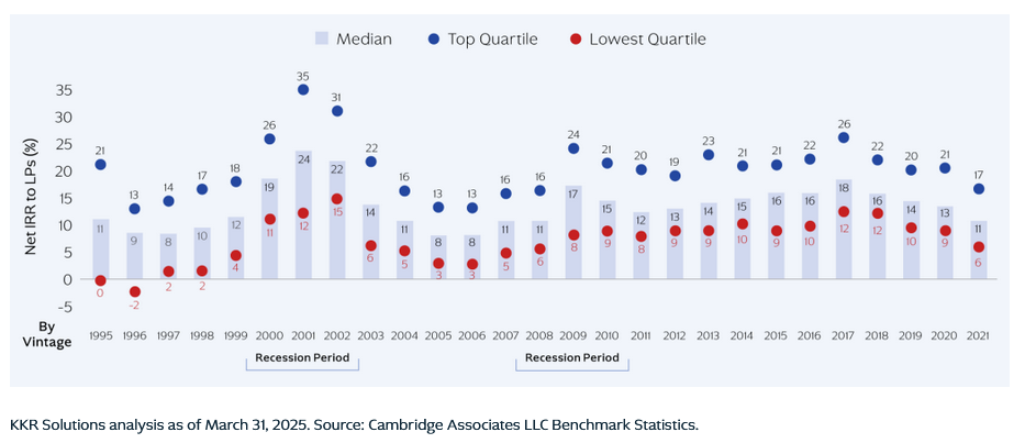 Similar to the public markets, alpha generation in private equity is uneven across managers. But in the private space, the performance dispersion is significantly wider. According to KKR, the historical return gap between top-performing and bottom-performing private equity managers is approximately 14%, underscoring the importance of manager selection.