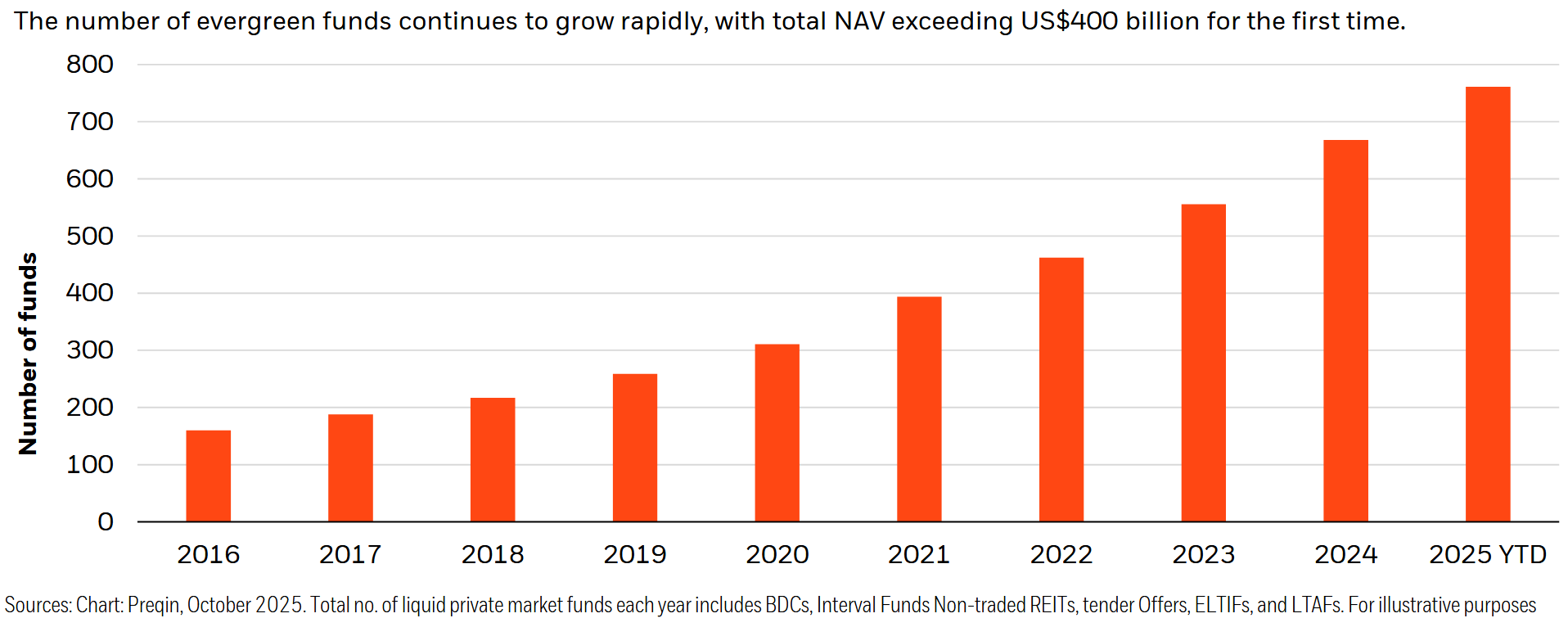 Evergreen funds still have gates and restricted liquidity, but investors can request redemption on a quarterly or semiannual basis. These funds deploy capital continuously and, to a great degree, can help reduce the J-curve effect.