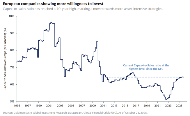 In Europe, companies have underinvested for two decades and there's renewed spending, driven by the energy transition, security and defense needs, reshoring, infrastructure upgrades, digitalization, and AI, that could provide a meaningful medium-term boost to growth.