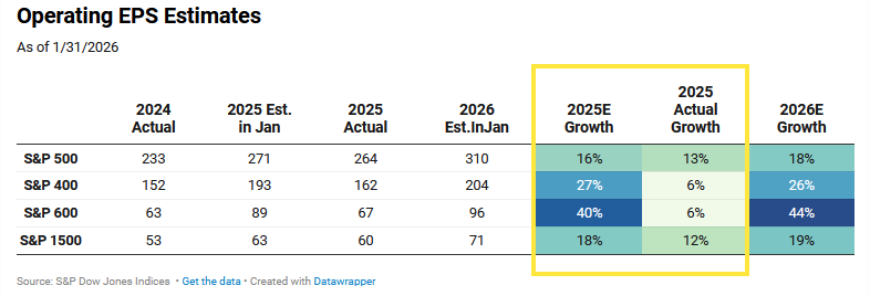 We have less conviction in small- and mid-cap (SMID) stocks’ earnings estimates. At the beginning of 2025, the market was optimistic but ultimately proved excessive about SMID. We believe investors WANT to broaden out, but whether SMID can meet those lofty estimates a second time around will depend on whether economic growth accelerates or decelerates.