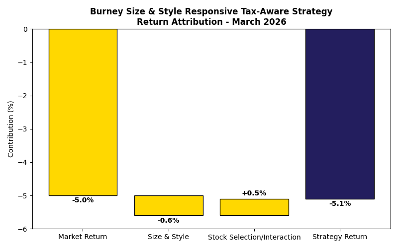 In March, the Size & Style Responsive (SSR) Tax-Aware portfolio lost 5.1%, which was similar to the S&P 1500's return of -5.0%.