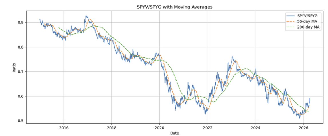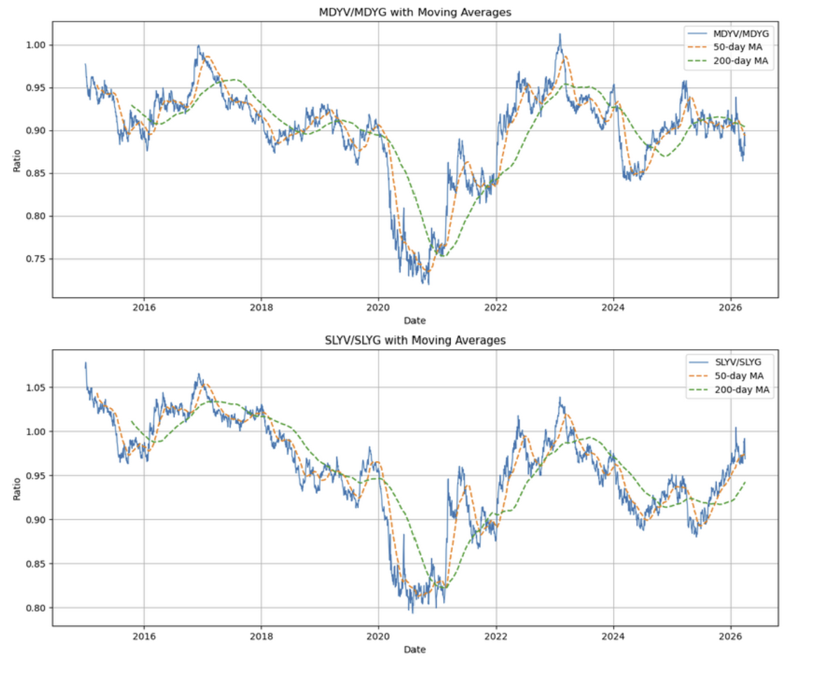 Within large-cap, while growth is still the dominant trend, it continues to weaken, and value continues to break out. Note the spike in the blue line in the plot above in February and the second spike in March. This is consistent with the relative underperformance of the market-weighted S&P relative to the equal-weighted S&P.