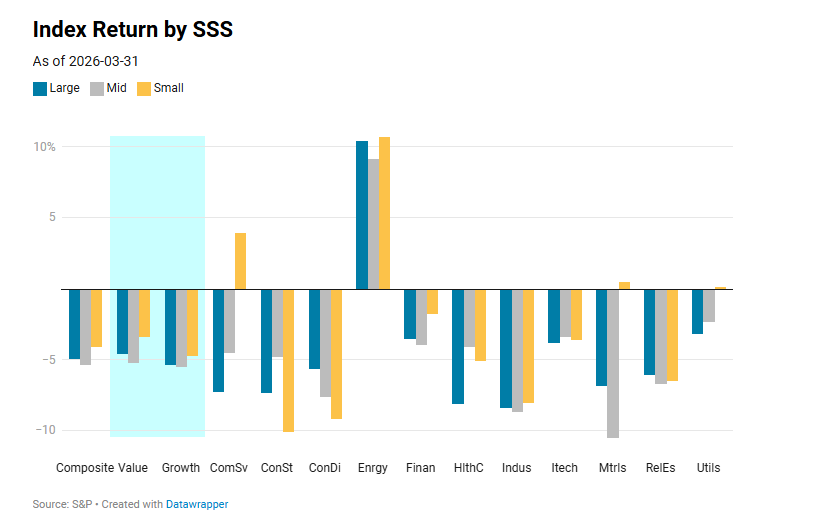 The size signal continued to weaken in March. Smaller companies continue to underperform larger companies on a relative basis, though the gap between them is shrinking. Throughout most of 2025, the Mag 7 drove market returns, but this trend began to reverse in 2026. In March of 2026, however, the conflict in Iran caused a market retreat as investors pondered the impacts of the conflict and disruptions to oil supply on the consumer and the global economy. The S&P 500 was down -5.1%. At the same time, the S&P SmallCap 600 was down 4.1% and the S&P MidCap 400 was down 4.2%. While the entire market was in retreat, large caps continued to underperform relative to small and midcap, which highlights the 2026 trend of lackluster large cap performance.