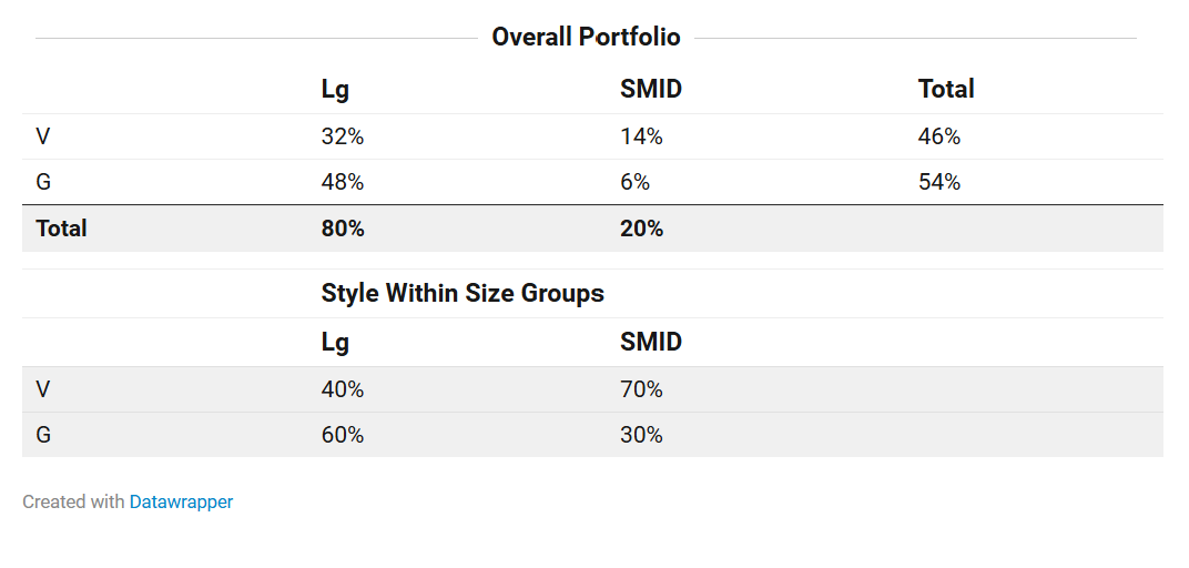 The table below shows the allocation of the portfolio by size and style.