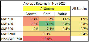 Despite headlines characterizing November’s pullback as an AI bubble burst, the data says otherwise. Investors actually bought low-valuation AI names in SMID while heavily selling AI stocks outside the S&P 1500, which are typically the unprofitable, speculative names we highlighted in last month’s market recap.