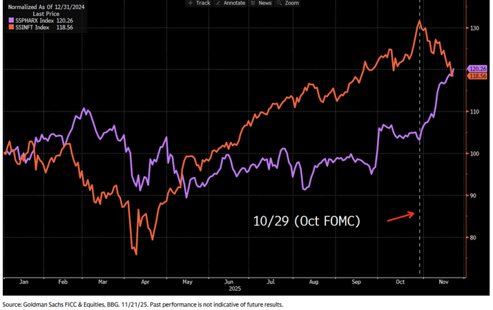 The Fed's hawkish tone in October clearly pivoted the market - the Nasdaq peaked that same day, and defensive industry like Pharma stocks have jumped since then.