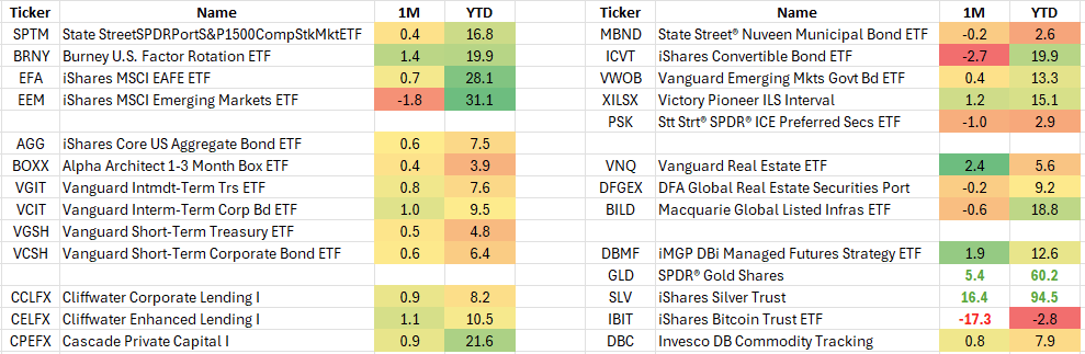 Year-to-date, equities - U.S. or international (EFA, EEM), public or private (CPEFX) - have delivered strong returns. Bonds held up well in November, with EM bonds (VWOB) outperforming EM equities (EEM). Catastrophe bonds (XILSX) and managed futures (DBMF) provided uncorrelated returns, while some alternatives came under pressure.